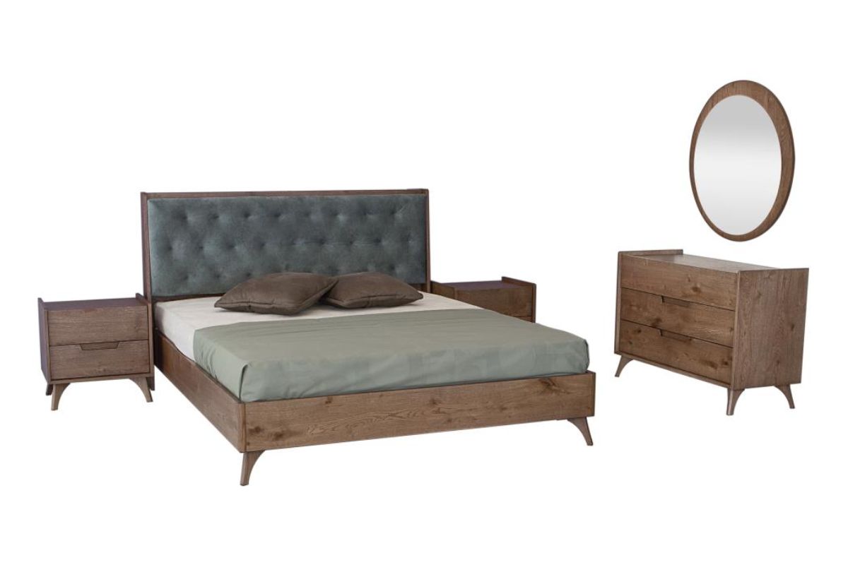 Το σετ κρεβατοκάμαρα Κλεοπάτρα, κατασκευασμένη από φυσικό καπλαμά δρυς ρουστίκ αποτελείται από κρεβάτι για στρώμα 160×200 με καπιτοναρισμένο κεφαλάρι με αδιάβροχο αλέκιαστο ύφασμα, δύο κομοδίνα, τουαλέτα με καθρέφτη.